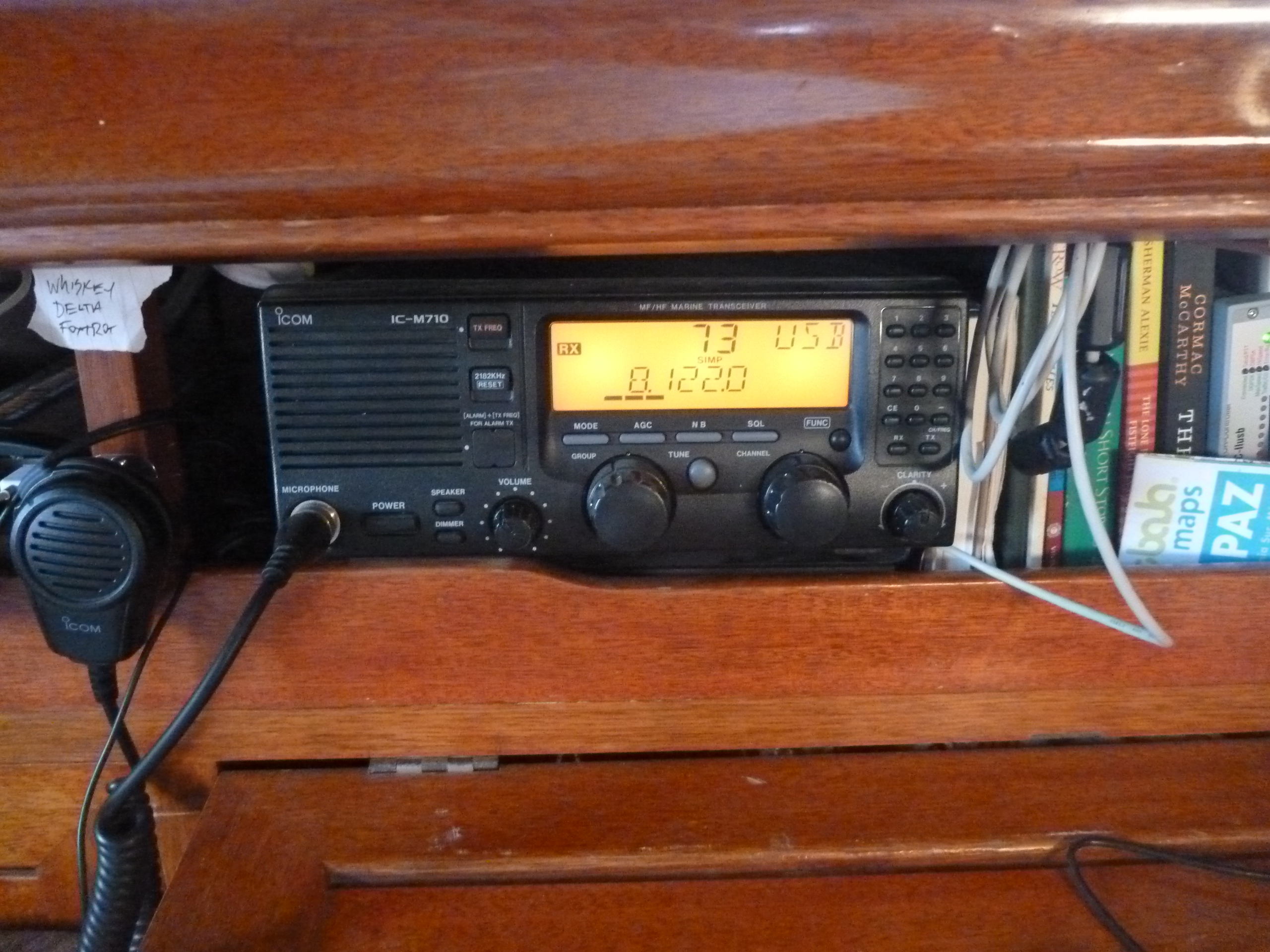 When not in a marina and thus beyond the reach of WIFI, Murre uses single sideband radio to communicate with shore. This technology allows voice communication with stations at great distance. Murre has heard news from China, game shows from Australia and has spoken with Oregon and El Salvador. When connected to a very slow and very loud modem on board, a modem I’ve attempted to quiet by sandwiching it on the bookshelf between Shakespeare’s Much Ado about Nothing and Pablo Martinez’s “only true and accurate” History of Lower California, the radio allows me to send and receive simple, all-text emails via a network of global receiver stations managed by Sailmail. And this is how I will tell YOTREPS, and you, where Murre is today.