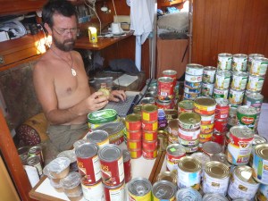 Among cruisers, strategies for taking on voyage-quantity stores differ widely. At one end of the spectrum are the aggressively organized sailors who create recipe books of meals and stock to that. If the boat is happy enough to contain a freezer, those in this group may pack away pre-prepared meals, labeled neatly for easy access when the going gets rough. At the other end are captains who send a crew member to the grocery store with orders to fill a large shopping cart with whatever and be back within the hour. One man’s advice to me was to fill the boat with as much food and as many tools as she could hold; then on the week before departure throw away the food and buy more tools.