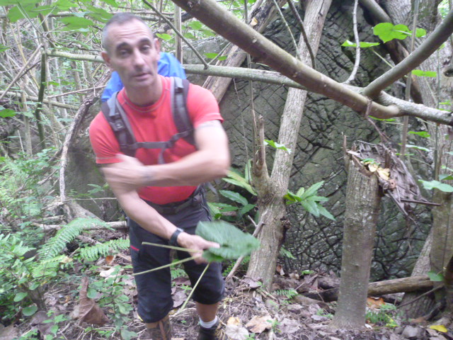 We descend into a valley that once had a bridge crossing its tiny stream and steep gorge, but last year’s rains washed it out. Now we descend and climb the sheer sides with a piece of knotted rope tied on one side to a stump and the other a large metal stake. David negotiates both sides while Anise snoozes, head lolling to one side as if a good shake would send it rolling down into the ravine.