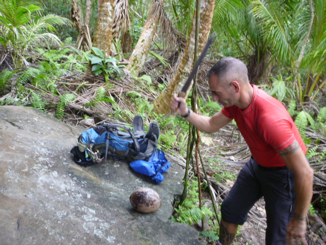 At a turn in the trail dominated by overhung boulders we pause for a lesson in coconut husking. Earlier I had mentioned the hour required for me to get at the meat using only my Bowie knife, at which Jerome smiled. “You must ask yourself if you are made for survival,” he says cryptically. On a flat spot in the rock he sets the coconut with stem-top facing away from him and with his machete he hacks out a “V” in the husk. Then he pries the rest of the husk off with the knife’s tip. Pointing to three small indentations in the now bare nut, he digs at each, finding the one that gives-up white meat. “Sink of zis as ze mouth–ze other two ze eyes,” he explains. Then he draws an imaginary line from the eyes over the forehead to the top of the nut. He positions this line so that the back of his machete blade meets it perpendicularly. One strong whack and the nut splits exactly in half. Eight minutes, start to finish.