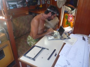 Let me be clear–I don’t need the computer; I just like it. Summer backpack trips and weekends on Murre excepted, I estimate I’ve spent time with a computer on most days for much of the last twenty five years. Booting is as normal as checking the time, as habitual as reading. It’s a useful tool that I’m use to, and as they say, “sailors like what they are use to.” But not to all. Some take pains to “unplug” during their cruise arguing that our generation has become addicted to connectivity, that the virtual world we have built is a barrier between us and the raw nature we cruisers have set out to experience. OK, but only to a point. Barriers to raw experience abound and can be quite handy. My skin is a barrier, my clothes, the glasses I now ware, the metaphors I use. Makemo’s thin reef crushes the ocean swell. Even the boat is a barrier between me and the raw experience of drowning. I’m rather fond of that barrier.