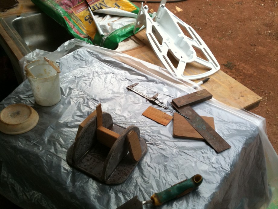Bracket being shaped and glued. Note aluminum “universal” bracket for radome in the back…