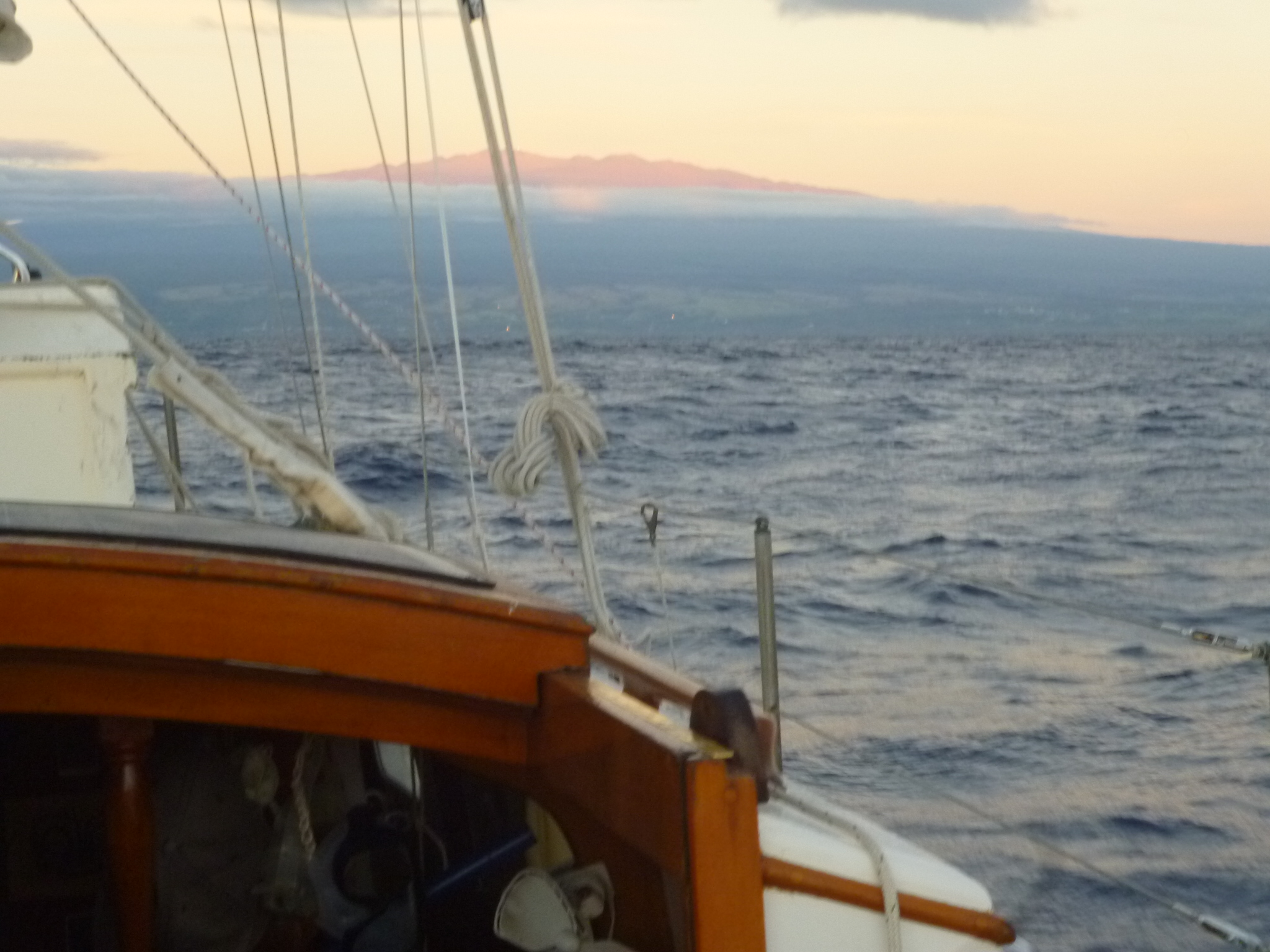 An hour later the wind abruptly eases to 6 knots from the east, and we are motoring with sails up. I’ve made it through, I think. But the lull is brief. Dark water ahead and the flash of white caps. When we are hit it is wind 20 gusting 25 from the east, forcing us to motor-sail as close hauled as can be for the last six hours to Kaumalapa Harbor on Lanai’s south side, tiny, rock-bound, with wind shooting down the canyon from the east and then the north. But secure, quiet, welcome. Anchor down by 1630. 57 miles in 13 and a half hours.