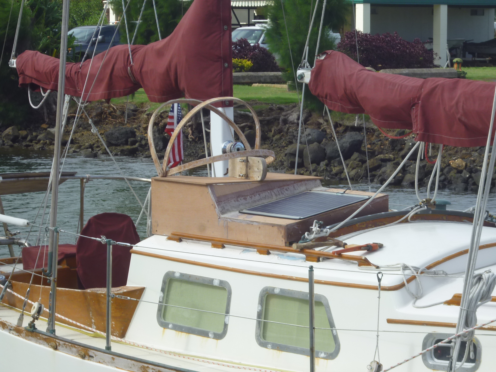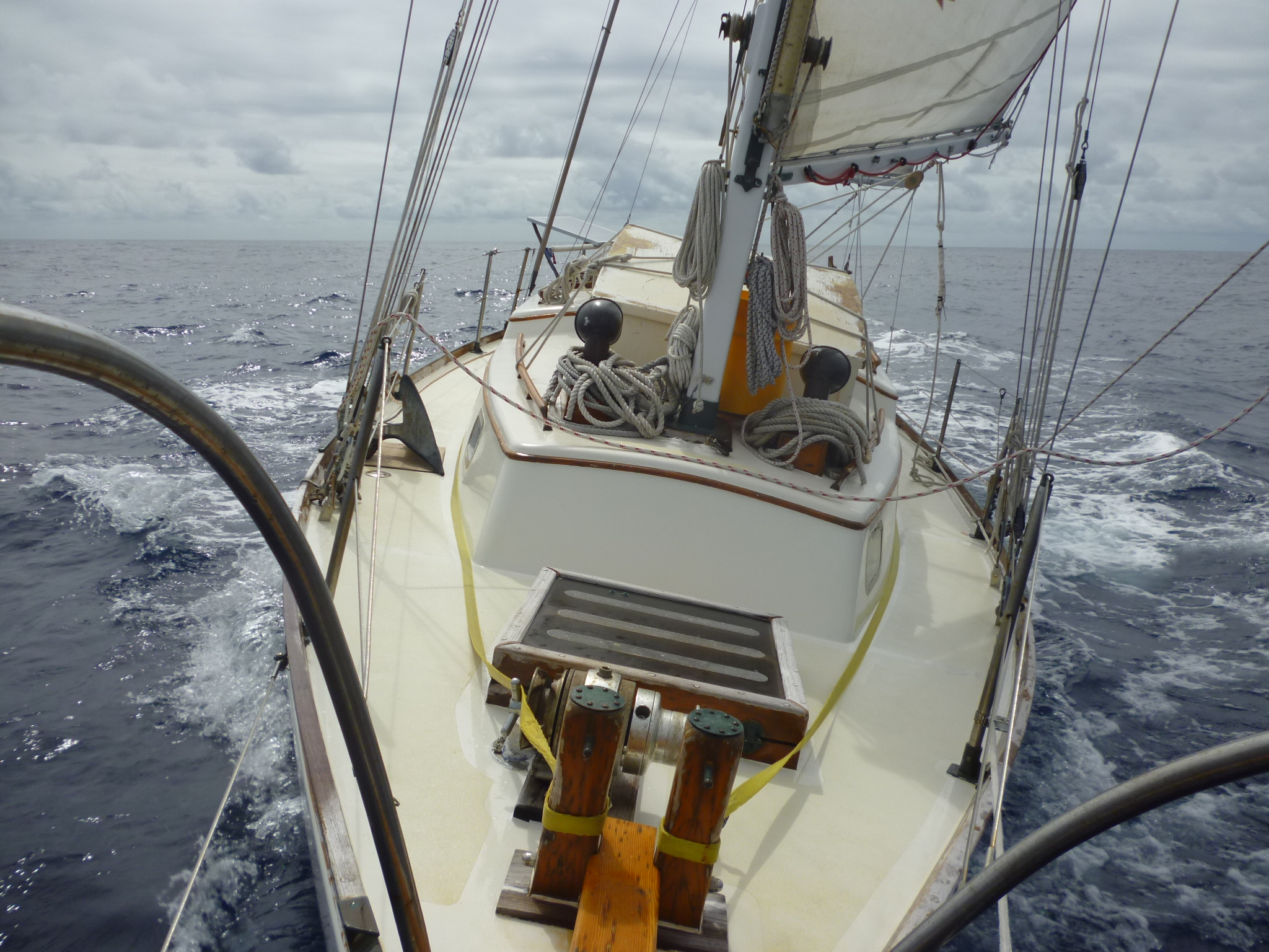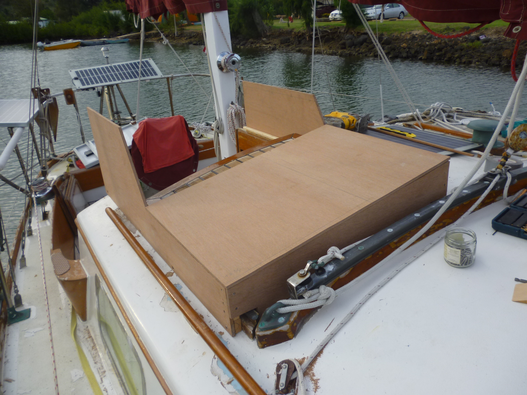 By design it was a busy month. After so long on the go and under the hot tropical sun, Murre was the worse for wear. Her toe rail varnish, entirely neglected since leaving San Francisco, had baked or blown off ; the paint of her coach roof crackled and curled; the beating mainsail and its batton pulled paint off the mast in chunks, and a year of rock and beach landings had worn down the dinghy to bare wood. During the passage to Hawaii, two of the five solar panels had ceased to function; the bracket holding the engine’s oil filter in place snapped, and deck leaks had soaked many of the cabin’s cushions, which now smelled of mildew. Maybe most importantly, weather on this leg north emphasized the need to protect the cockpit hatch from breaking waves. The list went on and on…