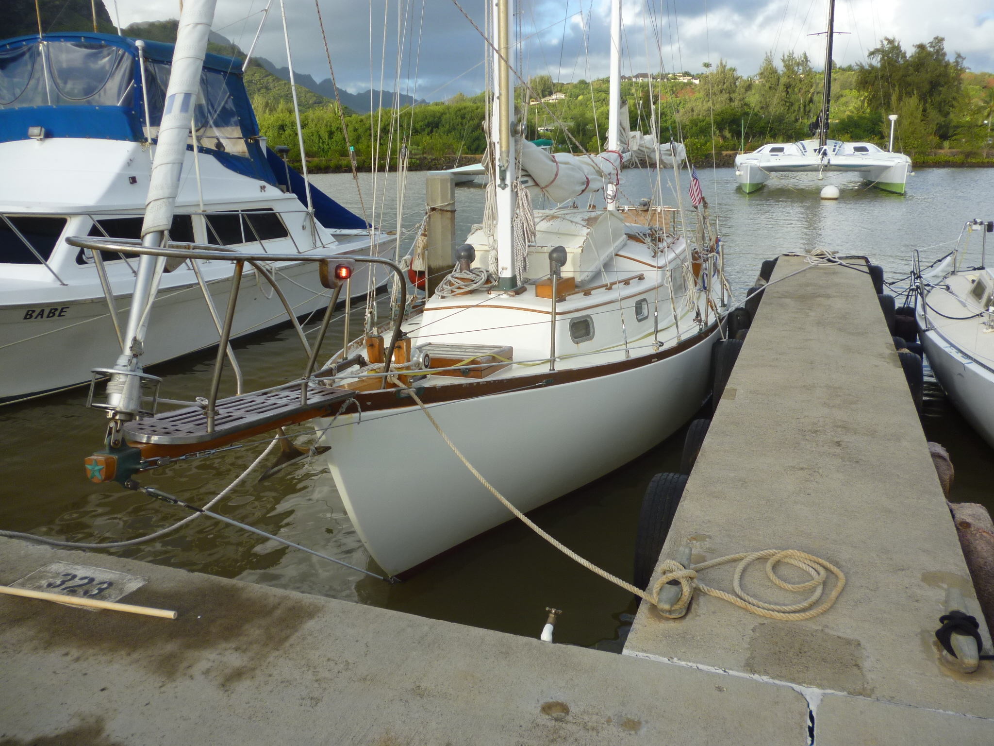 “Our house is yours–stay with us as long as you like,” they had said, and I wonder now if they later regretted such an open invitation. Because I moved right in, digging deep into the luxury of a real bed with soft, clean sheets, hot showers that required nothing more than the opening of a faucet, and home cooked meals, rich soups with fresh breads and brie and pickled herrings marinated in dill as accompaniment (the latter reflecting Nansy’s Norwegian heritage). From their lanai I could gaze out to the south and the ocean I’d just crossed; to the west was the bold line of mountains above Nawiliwili under which Murre relaxed in her berth, and to the north that range whose cloud covered peak, Mt. Waialeale, I knew to be the wettest place on earth. It was delicious. I stayed a month.