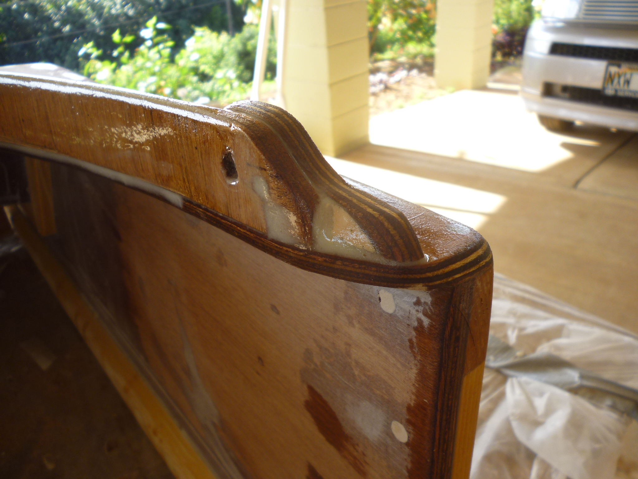 The hoops that would support the hood were made of several layers of 1/4" ply cut to into 1 1/2" wide strips and laminated into their correct shape around a frame of shaped 2 x 4s.