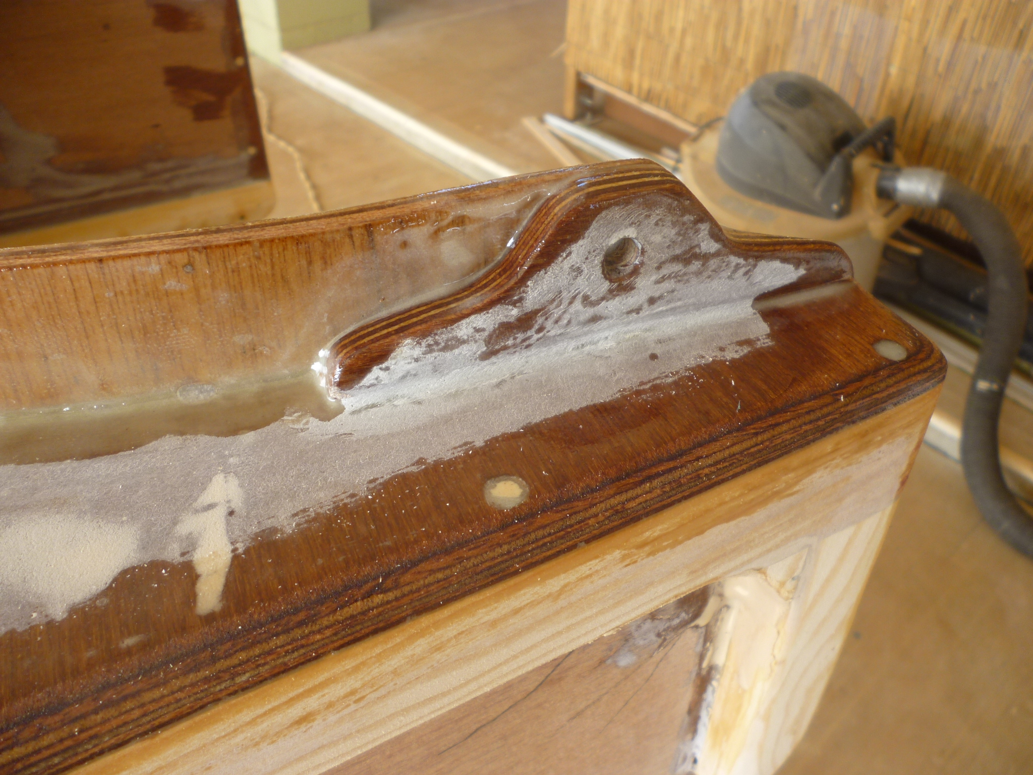 My previous work on Murre was, I liked to think, extensive and well executed–a cockpit rebuilt, a length of deck relaid, a bulkhead removed and renewed. But all this work was confined to replacing things that existed. The old was the pattern for the new and so my imagination had remained mostly untaxed. The cuddy design, however, needed inventing from thin air, and I was frequently at a loss how to proceed. As I stood befuddled over the construction table, I’d often find that Peter had softly sidled up. “Yes,” he would say, “I can see where you are going with this. The top will be nicely strengthened with the epoxy fillet and that extra rib,” neither of which I had yet contemplated.