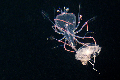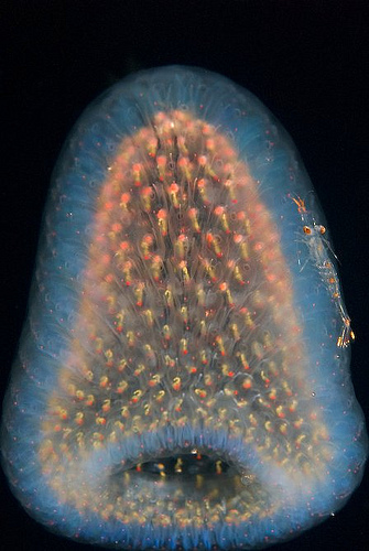 Then a blunt-nosed cone with the overall look of a raspberry inside of which swims a translucent shrimp. The shrimp exits the raspberry, climbs on top, does some business and returns before shrimp and raspberry drift beyond my light.