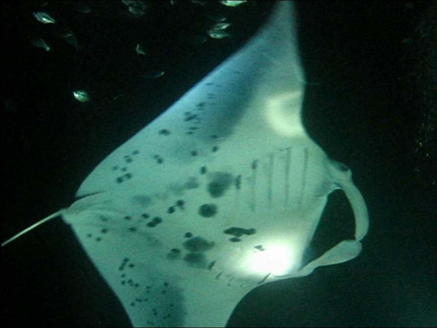 Then there are three Mantas, then five, swinging through the circle. Most have a wingspan of six to eight feet, their great, white mouths, large enough to swallow me head and shoulders, agape, toothless cottony cavities bordered by antenna-like scoops. The bellies are white and spotted with grey in a way distinctive to each individual. The top of the animal is entirely black; clinging to it are tiny, shrimp-like parasites. The narrow, ray tail contains no stinger and is as long as the animal is wide.