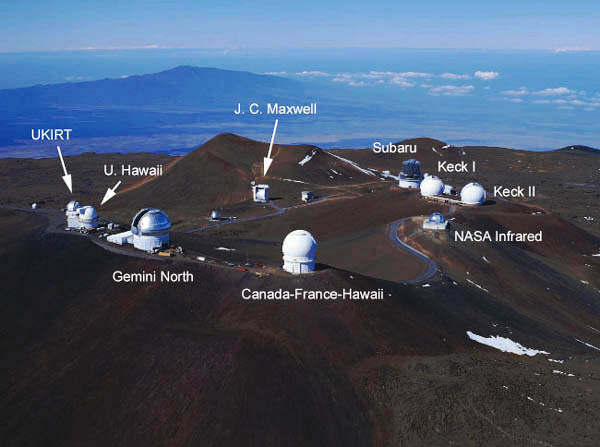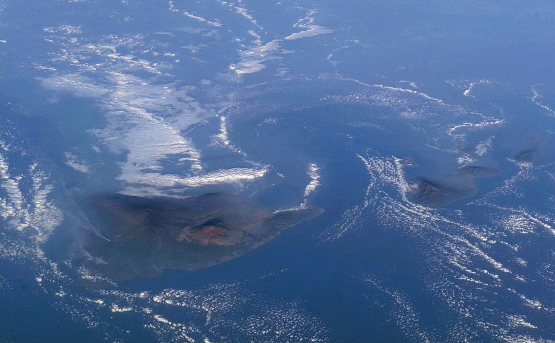 The Alenuihaha Channel from space. The camera is facing southwest with the Big Island on the left, Maui, Lanai, Molokai to the right. Note the flow of trade winds into the channel as indicated by the funneling of cumulus clouds. Maui's Haleakala at 10,000 feet can be seen as well as the Mauna Kea crater on the Big Island at 14,000. Upalo Point juts out into the channel and Murre's destination, Kailua-Kona is the dark spot of coast directly above Mauna Kea.