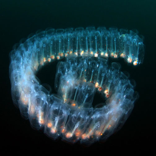 For twenty minutes Matthew moves through a binder of slides–pictures of tiny translucent animals, alien in form and name–pyrosomes and pteropods, salps, heteropods, and siphonophores. He says there may be box jellies (get out of the way) and comb jellies and sea horses, paper nautiluses, squids of various sizes and types.